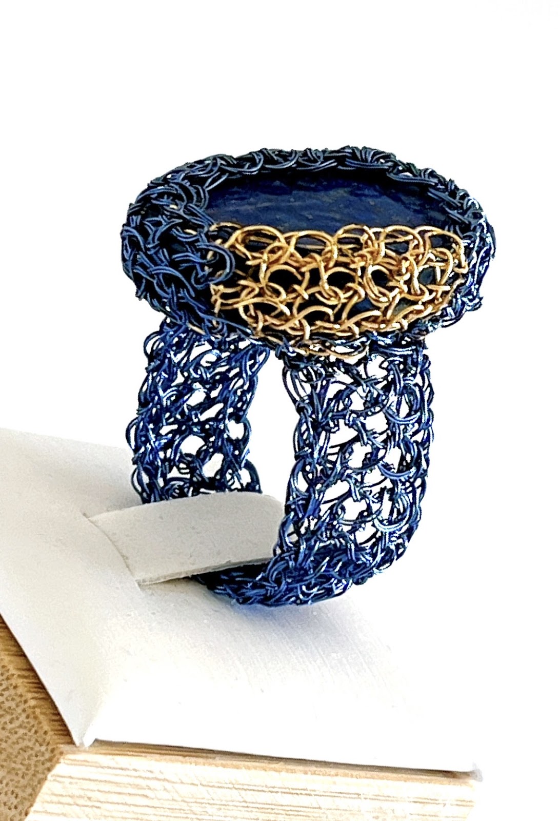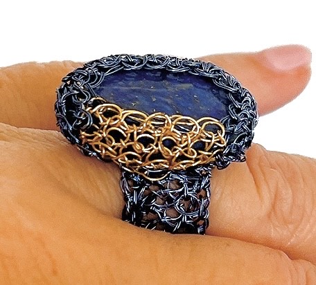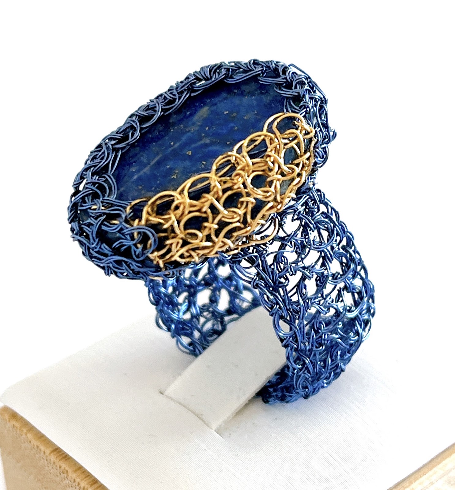 Este anillo evoca la profundidad del cielo estrellado. Anillo tejido completamente a mano con alambre azul profundo y dorado, que enmarca una gema natural de lapislázuli.