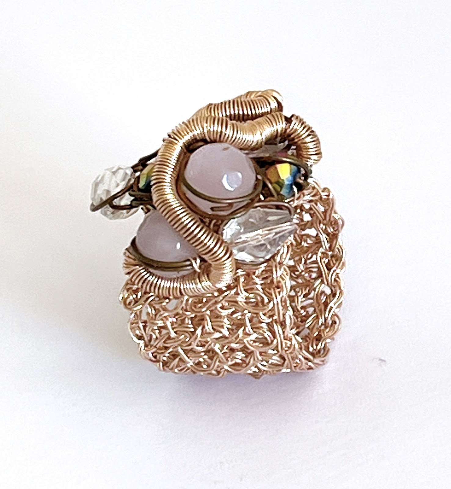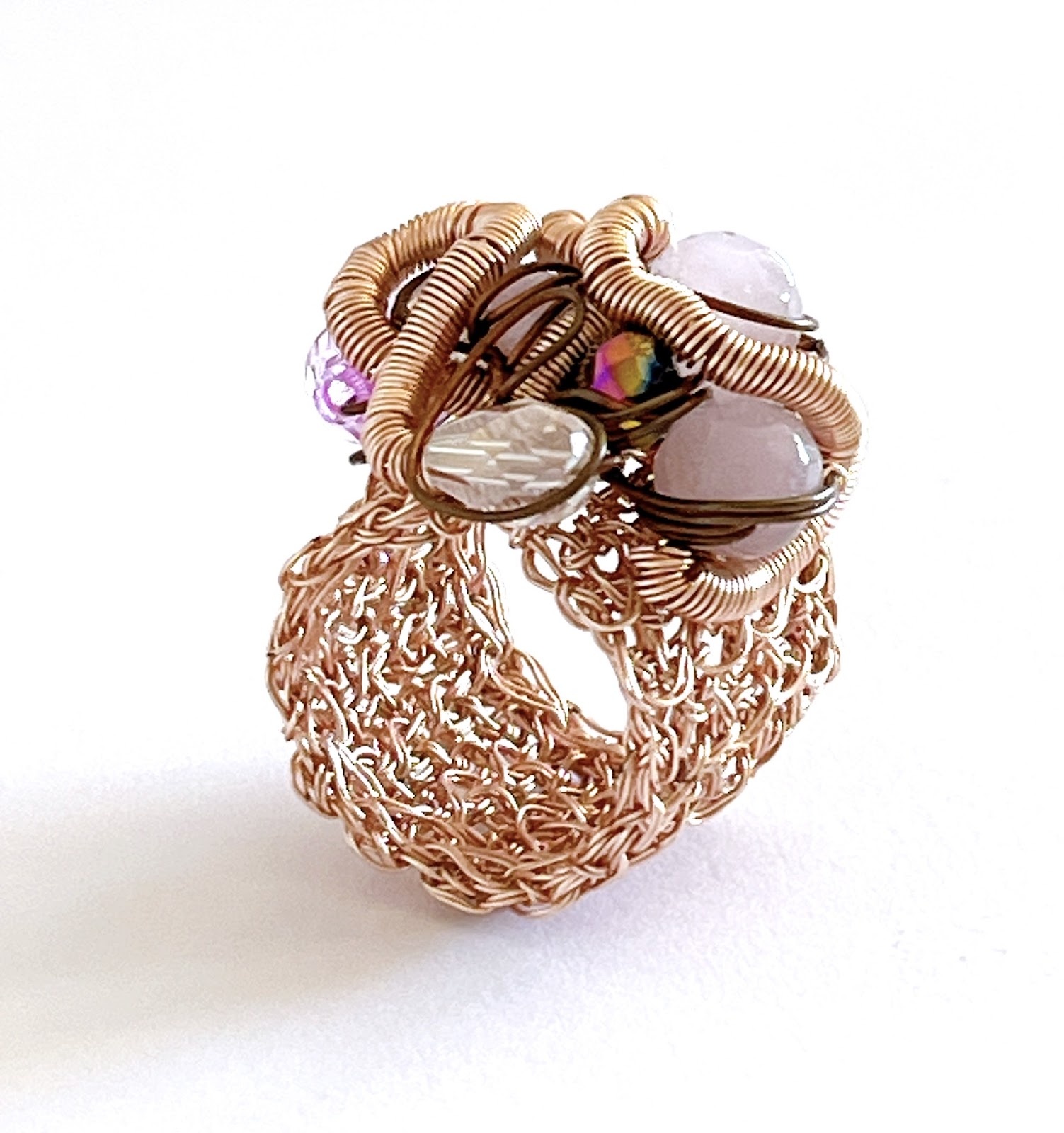 Ideal para sumar un toque de arte y brillo a tu día. Anillo tejido a mano con alambre de cobre en baño de oro rosa, decorado con delicadas gemas y cristales tallados que capturan la luz en cada movimiento.