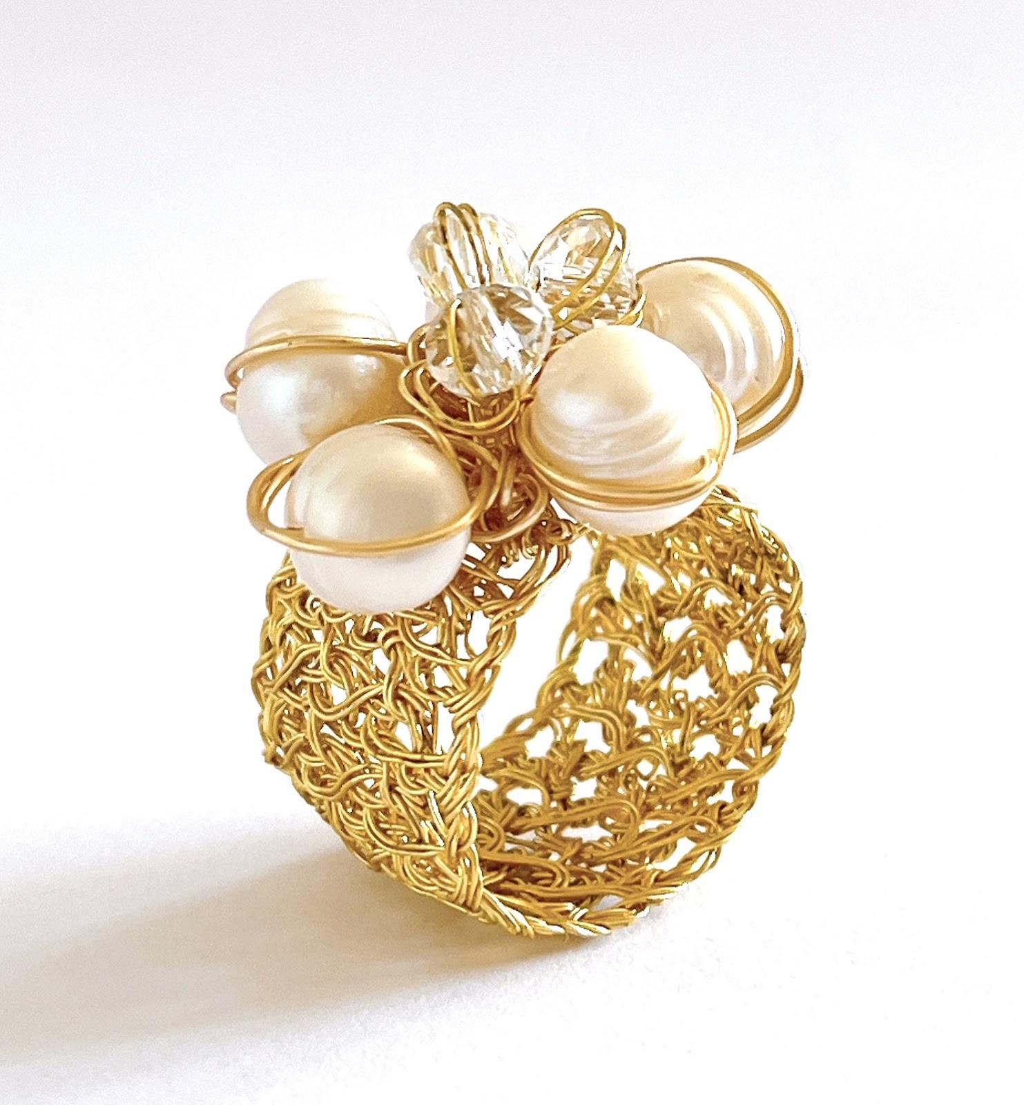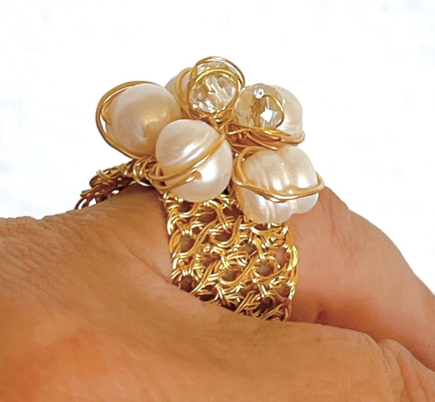 Anillo tejido a mano con alambre de cobre con baño de oro de 14K, coronado por perlas de río y cristales que evocan pureza y sofisticación.Las perlas aportan luz y elegancia atemporal, mientras los cristales reflejan destellos sutiles que embellecen cada gesto.