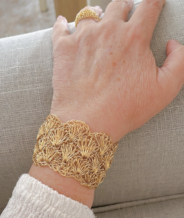 Brazalete tejido a mano con una técnica artesanal cuyas características son únicas y diferentes, inspirado en formas florales que se abren como un abrazo dorado.
