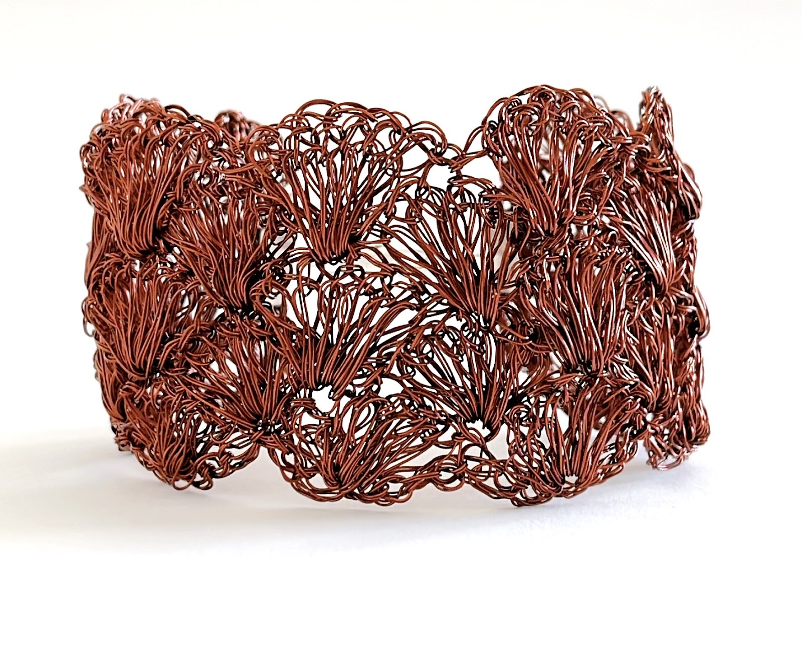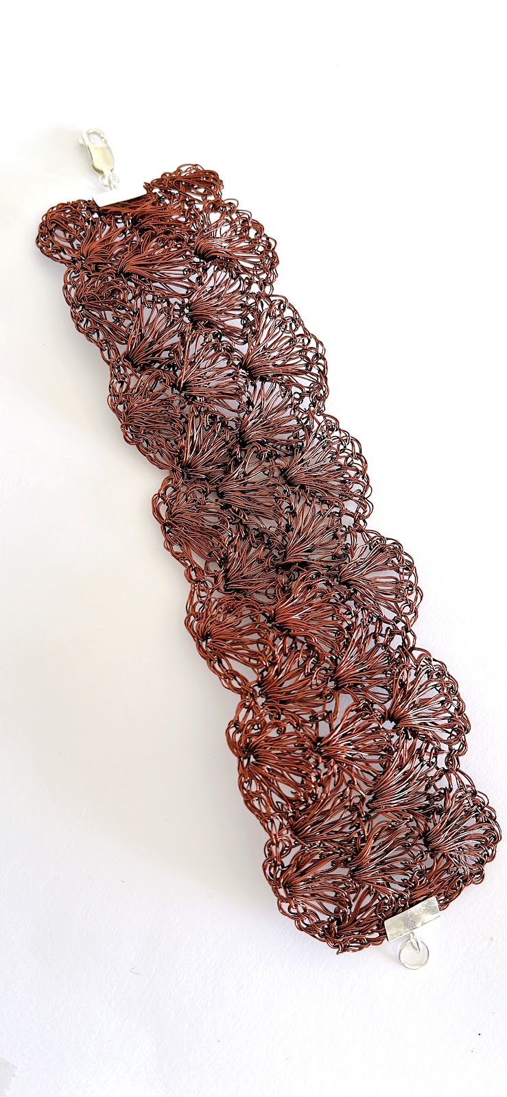 Su textura firme y natural conecta con lo esencial, con lo eterno. Brazalete tejido a mano en cobre puro. Cada nudo evoca la energía vital que asciende desde la tierra, con un diseño que abraza la muñeca como una forma orgánica en expansión.