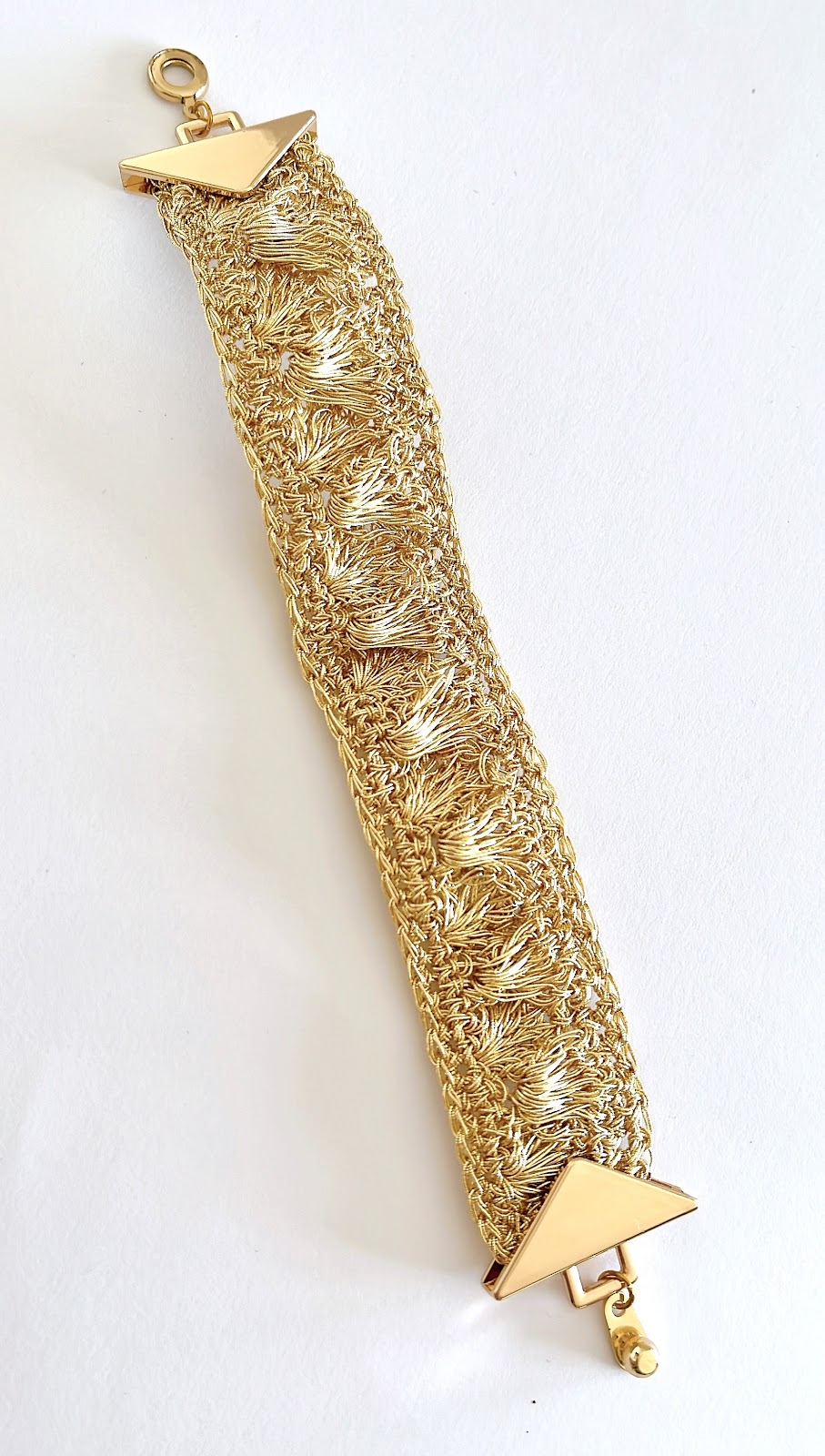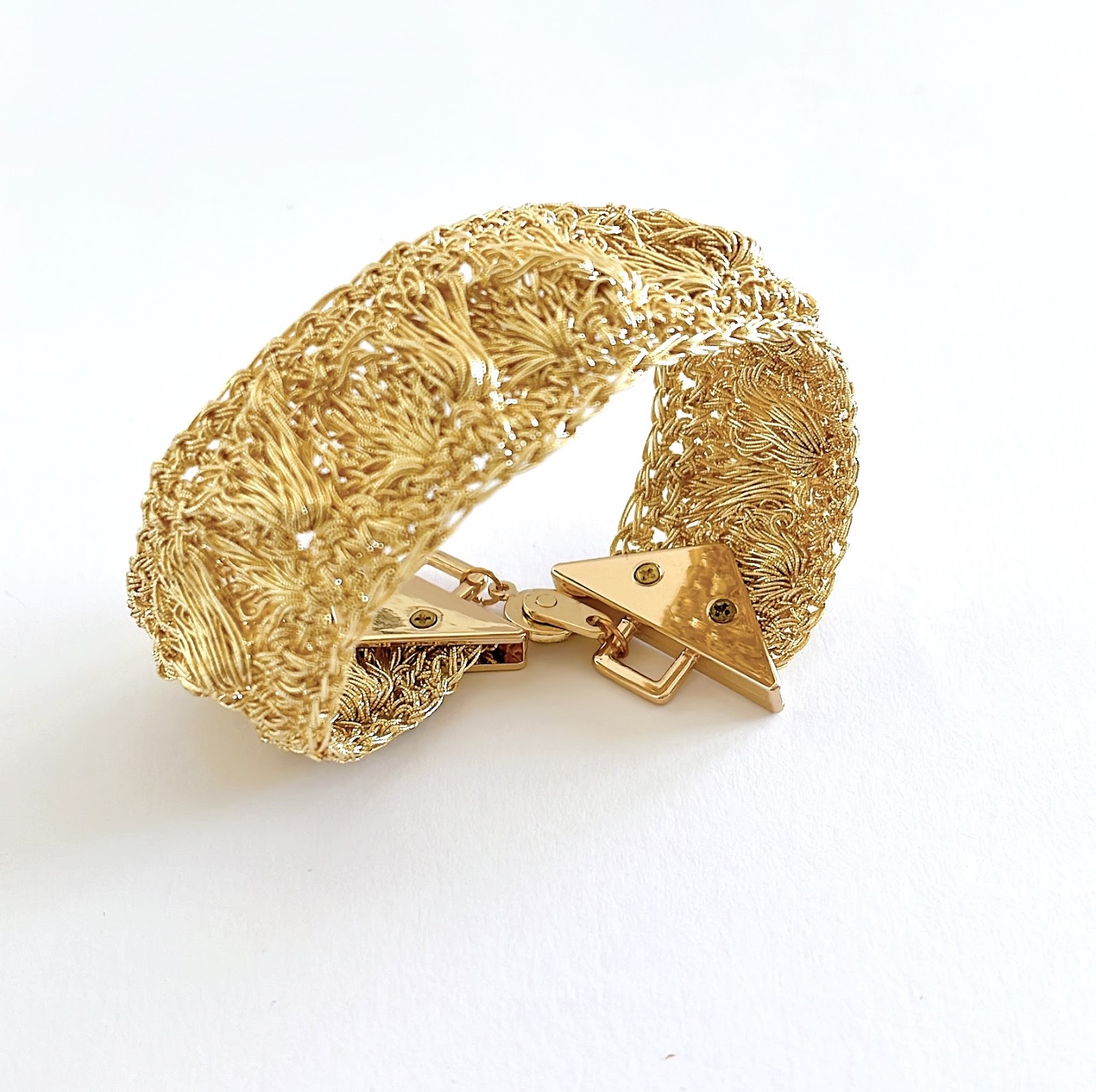 Su textura flexible y envolvente combina ligereza con un brillo sutil y sofisticado. Brazalete tejido a mano con hilo de algodón laminado con lamé dorado.
