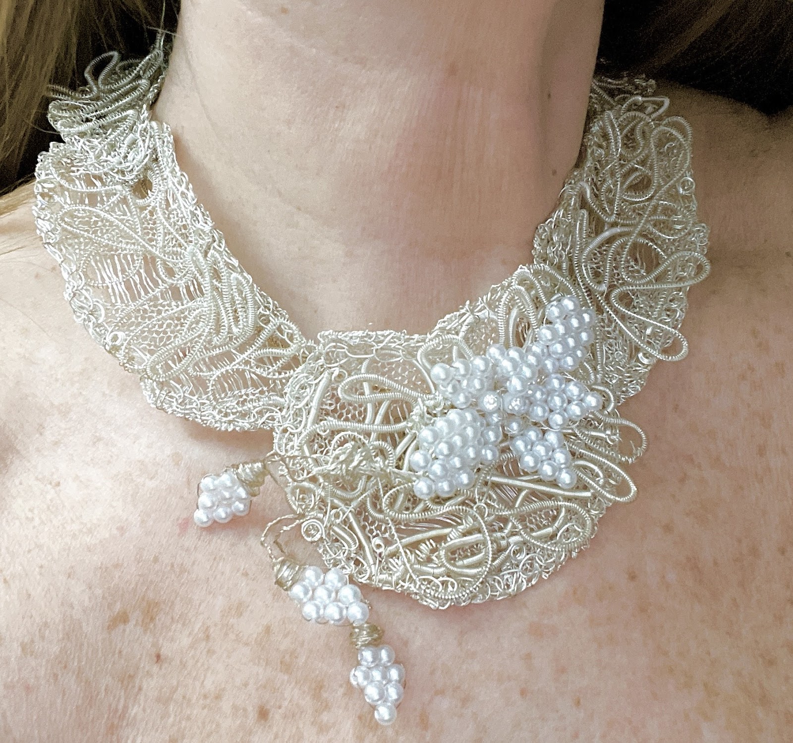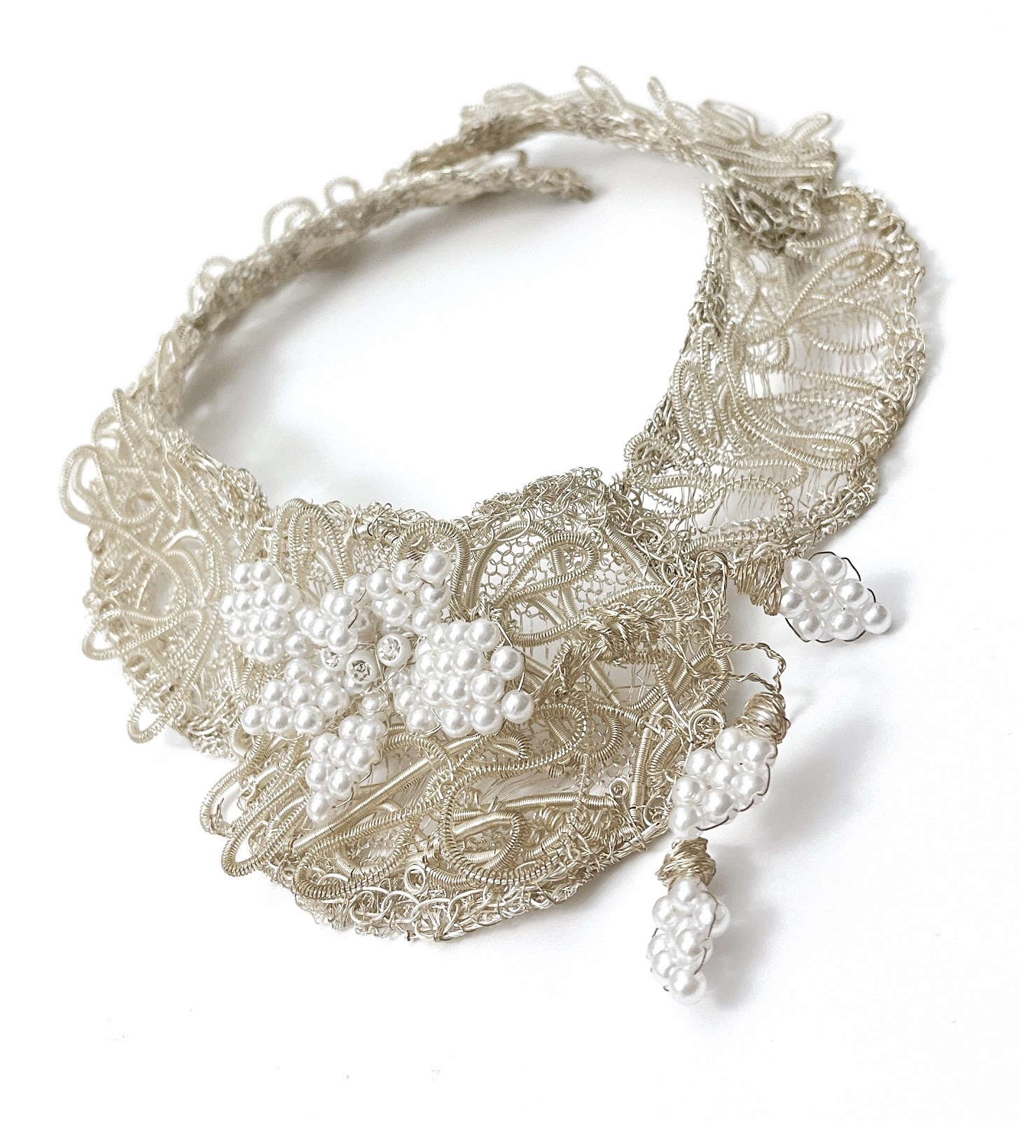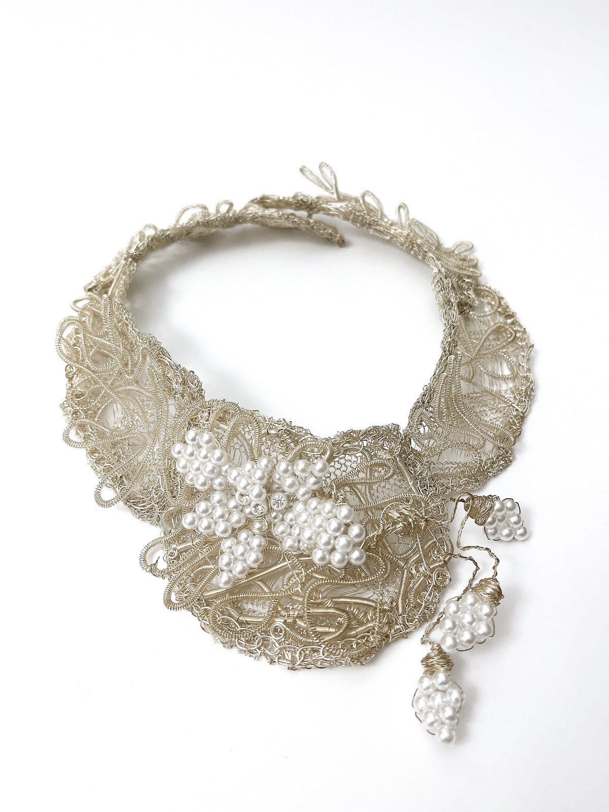 Gargantilla tejida con alambre de plata y un diseño floral central creado con perlas nacaradas que evocan la pureza del rocío matinal. Cada trazo del tejido envuelve el cuello como un encaje etéreo, con una caída lateral de delicados racimos que acentúan su elegancia natural.