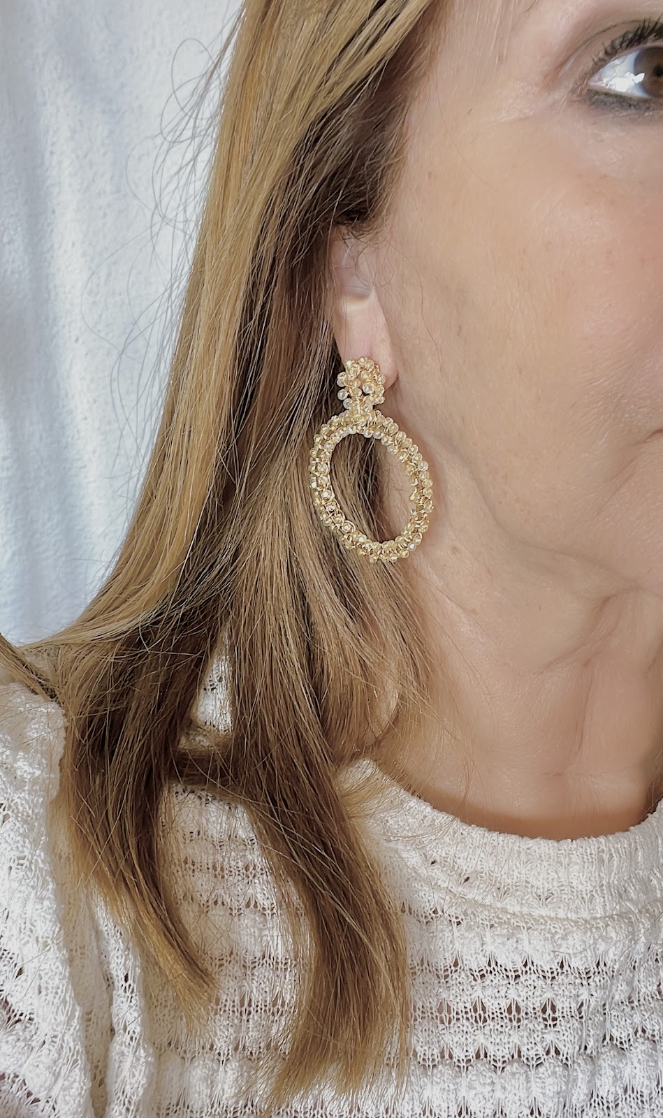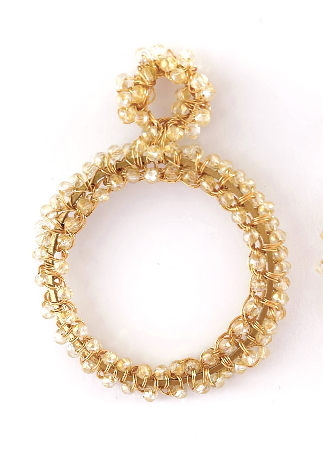 Un diseño versátil que combina elegancia clásica con trabajo artesanal. Pendientes tejidos a mano con cristales que envuelven un círculo dorado en total armonía.