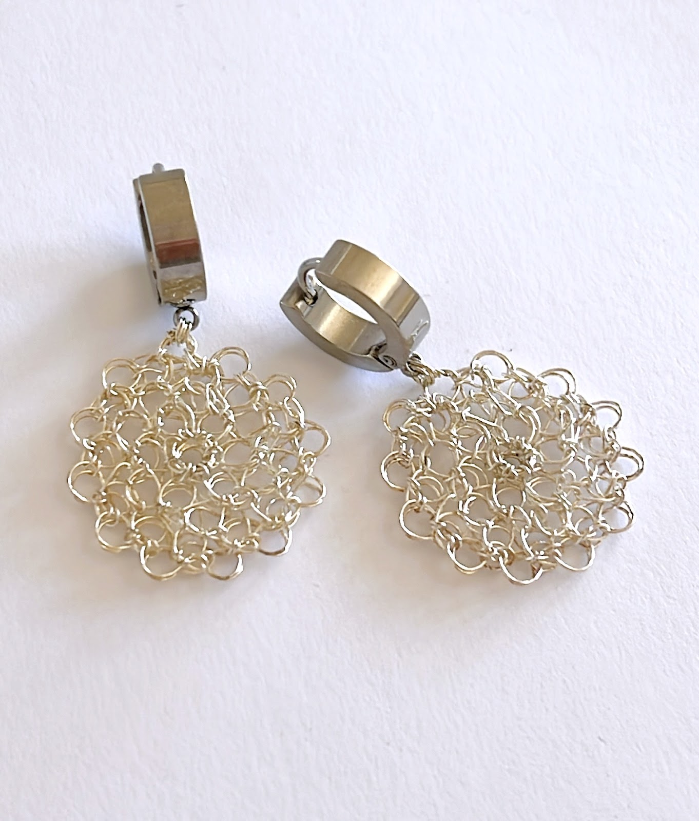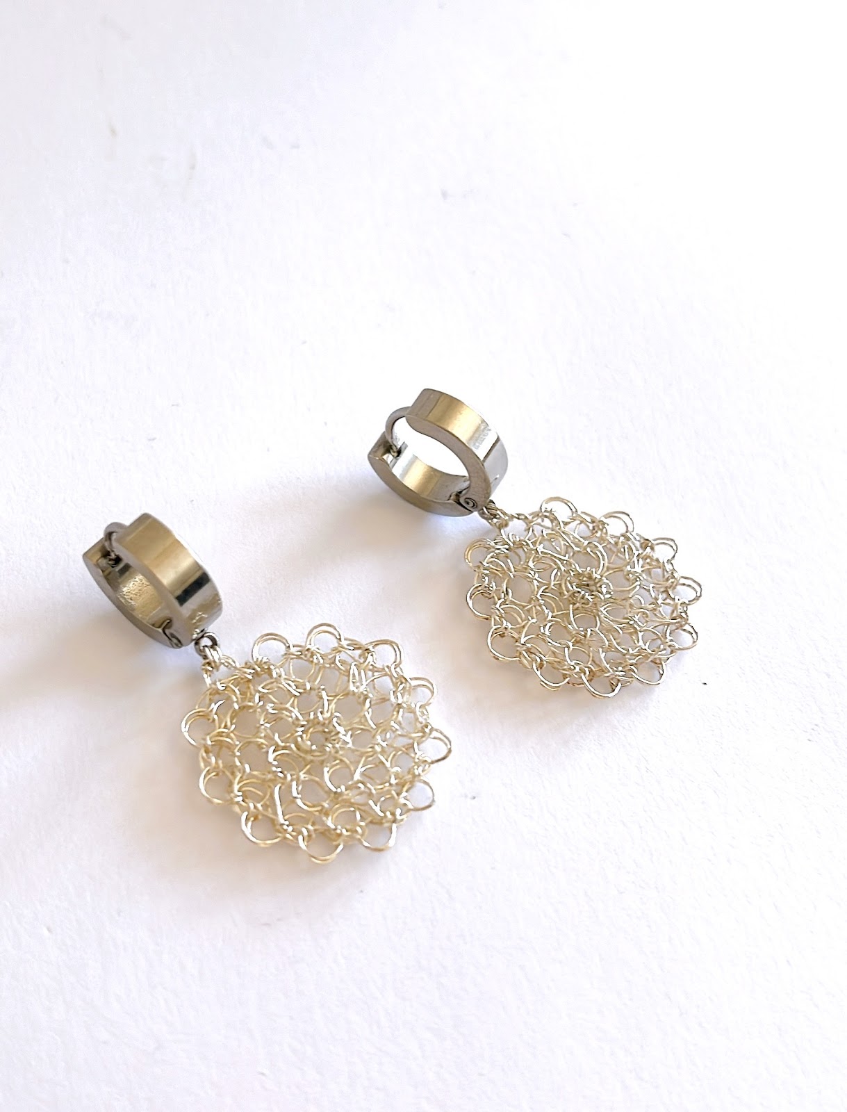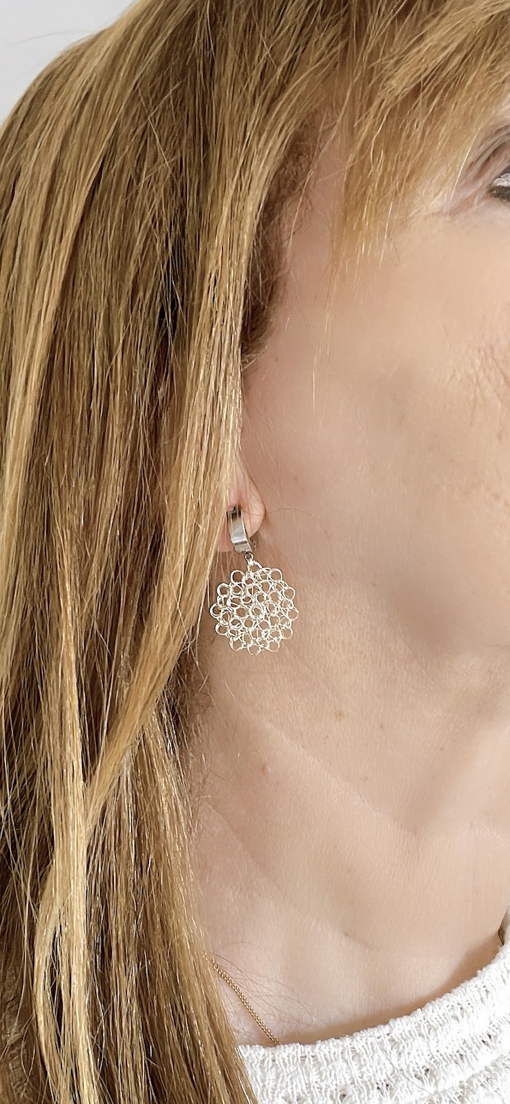 Pendiente tejido a mano con la técnica de Punto Crochet, formando una red circular de delicadeza etérea.El diseño es liviano, elegante y atemporal, perfecto para acompañarte en ocasiones especiales o dar un brillo único a tu día a día.