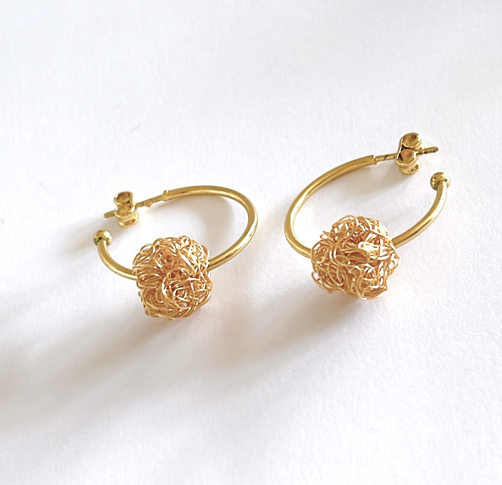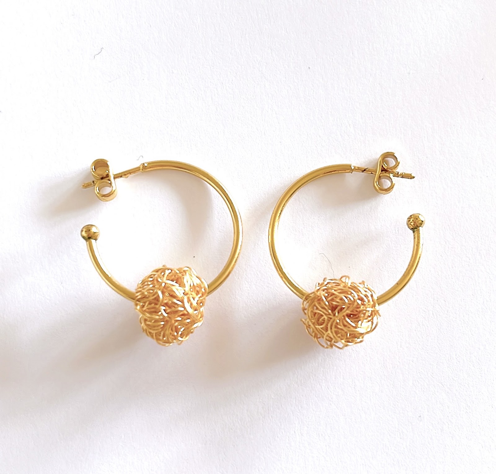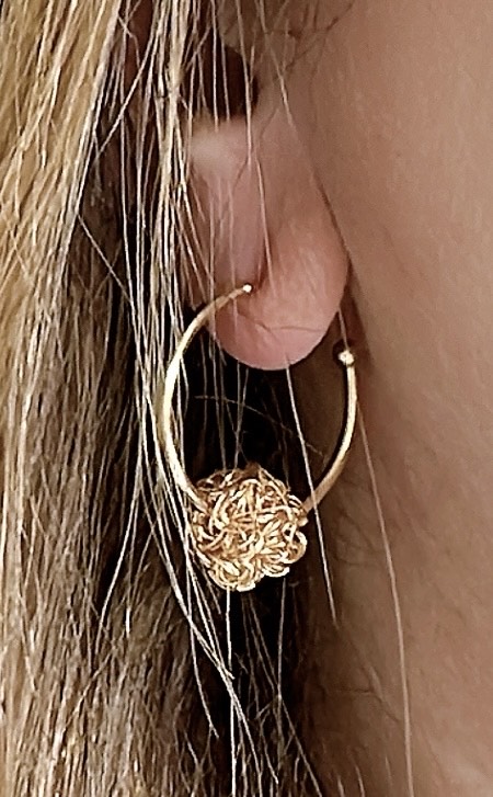 Pendientes con aro abierto y esfera tejida a mano en alambre dorado, como un pequeño corazón suspendido.