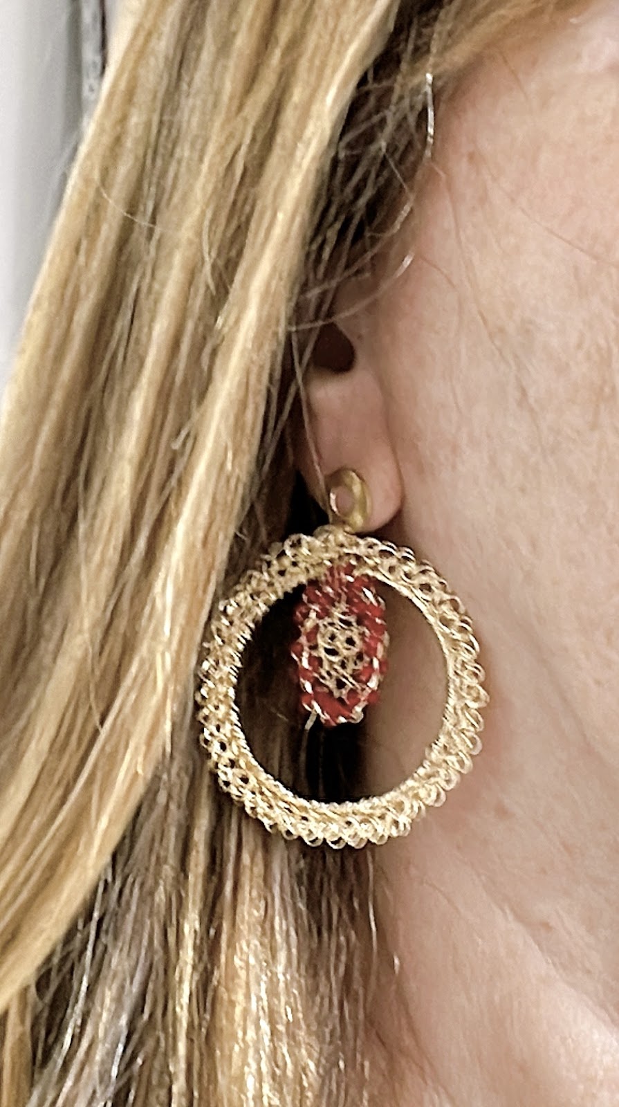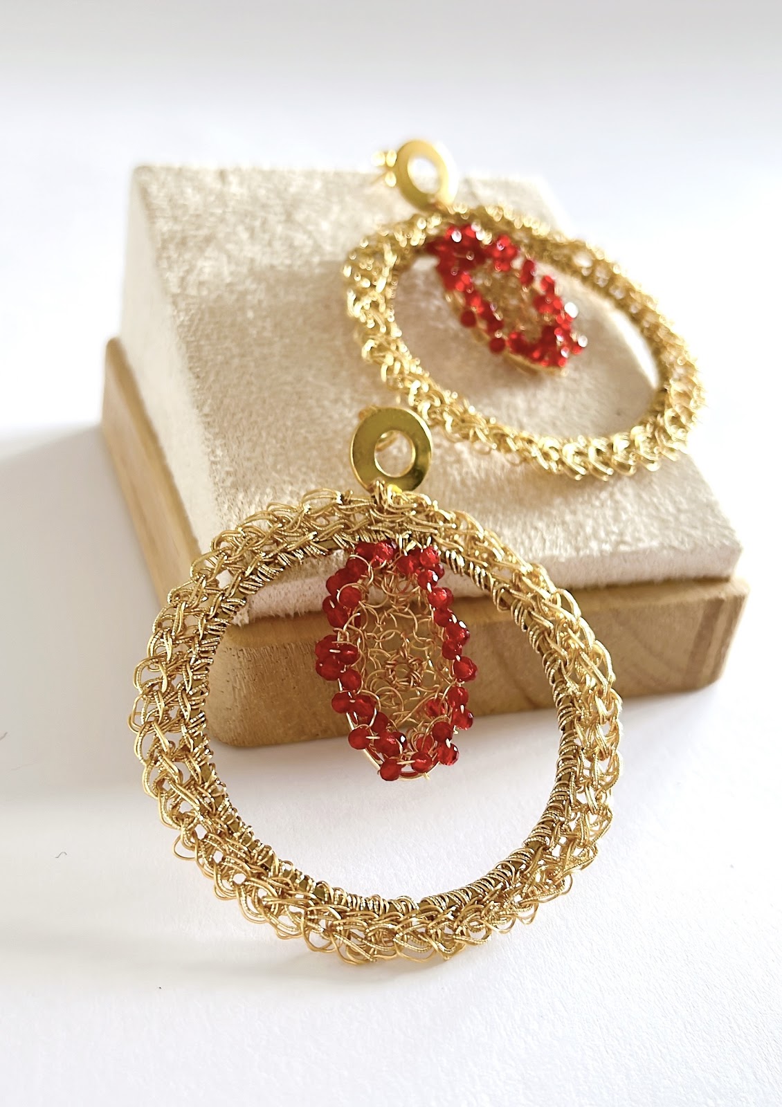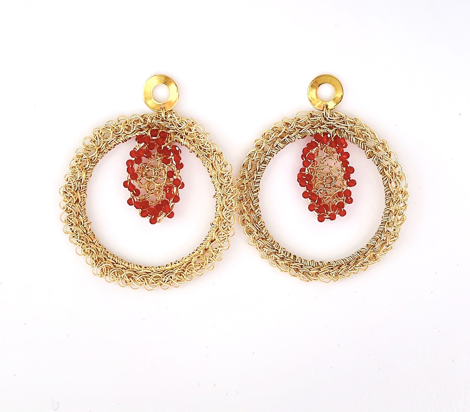 La fuerza del color y la delicadeza del tejido conviven en una joya luminosa y expresiva. Pendientes tejidos a mano con un aro dorado que enmarca un corazón vibrante de cristales rojos.
