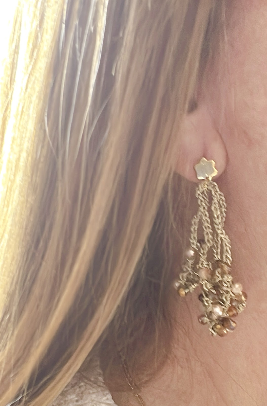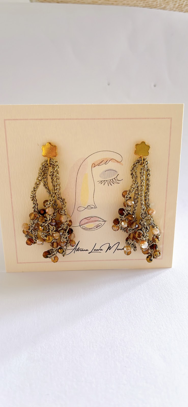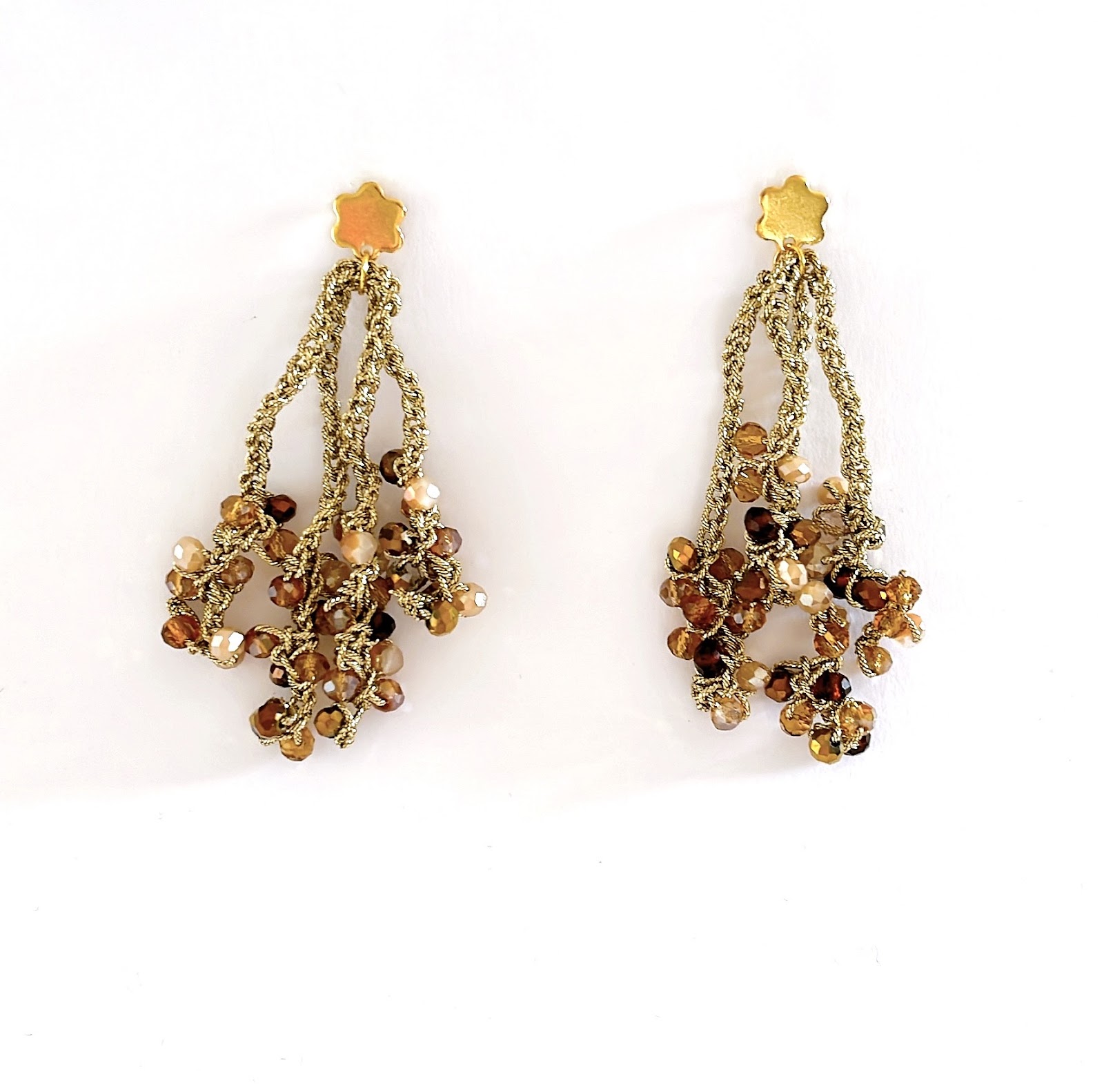 Una joya cálida y vibrante, perfecta para iluminar cualquier ocasión. Pendientes tejidos a mano en dorado con cristales en tonos miel, tierra y bronce.
